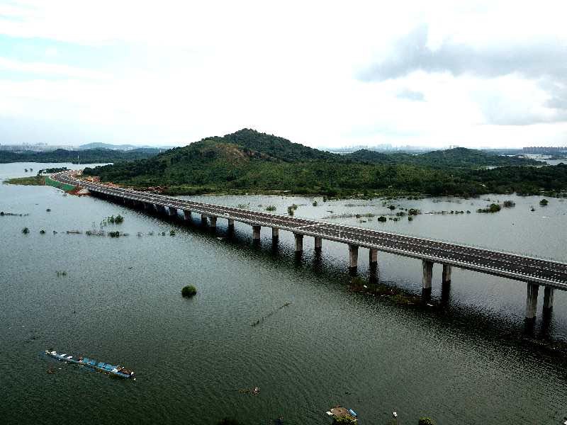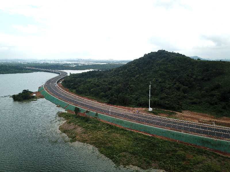 武汉经济开发区官莲湖畔,一条新建的快速路已悄然立起在美丽的湖光山色之间,从北面官莲湖东路,自北向南跨越下善湖后绕行鸳龙山,向南纵跨通顺河,顺接军纱大道汉南段。两段路基将下善湖、鸳龙山两座大桥串连在一起,宛如一条长龙卧伏在翠山绿丘、湖水粼粼之中,形成一副天然绝伦的美景。这条全长3.76公里,设计车速每小时60公里,双向6车道,宽阔通畅的快速路建成,让“中车都”武汉经济开发区区域路网更加优化、便捷。