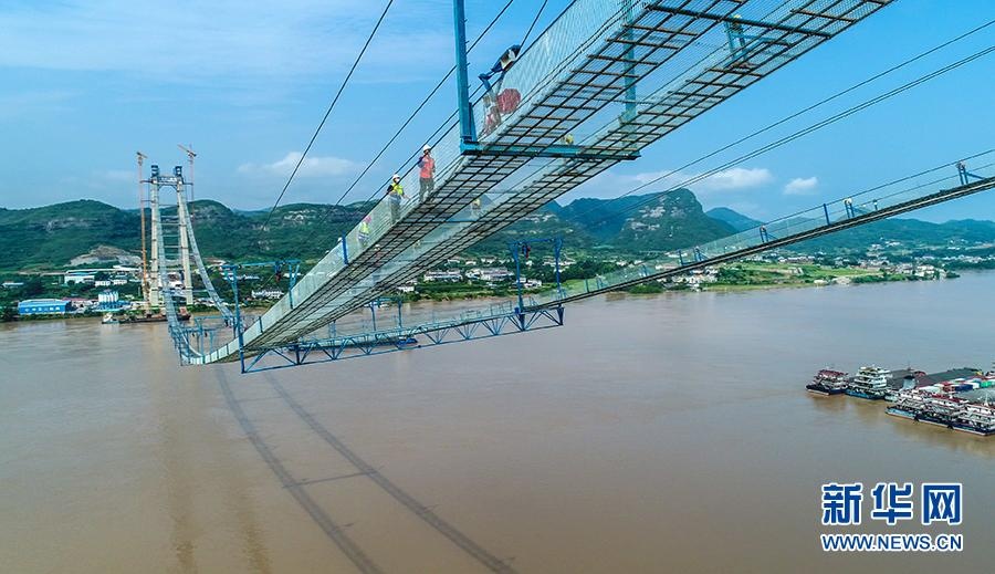湖北宜昌伍家岗长江大桥日前进入主缆架设施工阶段,其首根主缆索股随着拽拉器的牵引以每分钟20米的速度由南向北缓缓“过江”完成架设。